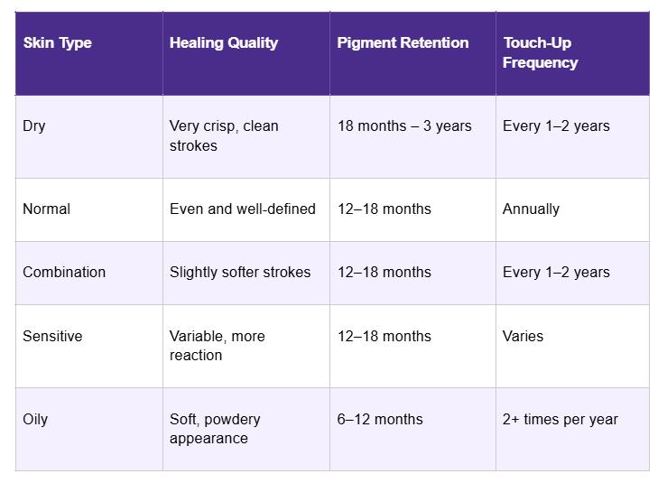 Dry skin is the ideal candidate for microblading. Because there is very little oil to dilute or push out the pigment, strokes stay sharp and color holds beautifully. Results can last anywhere from 18 months to 3 years, with touch-ups needed only every one to two years.